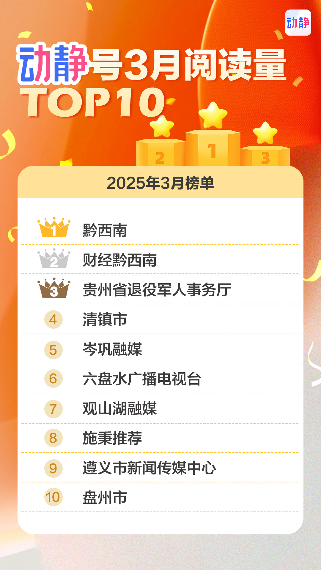 值得注意的是岑巩融媒、七星关区融媒体中心、六盘水广播电视台、黔西南、财经黔西南、贵州省退役军人事务厅这6家动静号在发稿量和阅读量上都遥遥领先,登上了两份榜单,可谓是既有量,又有质。