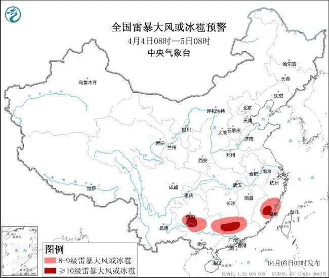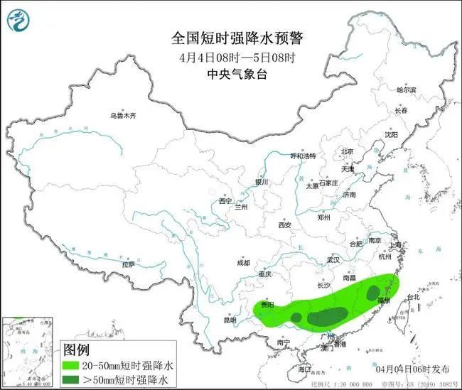 预计4月4日08时至5日08时,湖南南部、江西西南部、浙江南部、福建中东部、贵州南部、广西北部、广东中北部等地的部分地区将有8级以上雷暴大风或冰雹天气,其中,福建中部、贵州南部、广西西北部和东北部、广东北部等地的部分地区将有10级以上雷暴大风,局地风力可达11级以上;湖南南部、江西中南部、浙江南部、福建、贵州南部、广西北部、广东中北部等地的部分地区将有小时雨量大于20毫米的短时强降水天气,其中,江西南部、福建中部、广西东北部、广东北部等地的部分地区最大小时雨量大于50毫米,局地可达80毫米以上。预计,强对流的主要影响时段为今天午后到夜间。
