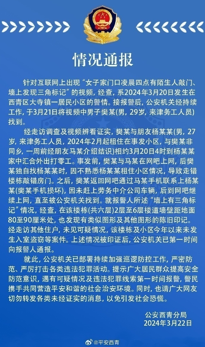 针对互联网上出现“女子家门口凌晨四点有陌生人敲门墙上发现三角标记”的视频,经查,系2024年3月20日发生在西青区大寺镇一居民小区的警情。接报警后,公安机关经持续工作,于3月21日将视频中男子樊某(男,29岁,来津务工人员)找到。