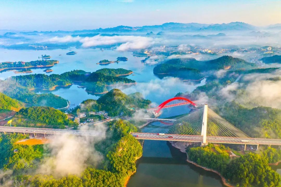 驱车前往G320线花鱼洞大桥,远远望去,“提篮”式的红色主拱跨越红枫湖,如一道美丽的彩虹,点缀在青山绿水间。候鸟迁徙的季节,大桥上方万鸟飞越,仿佛奏响一曲天、地、人共同谱写的交响乐。