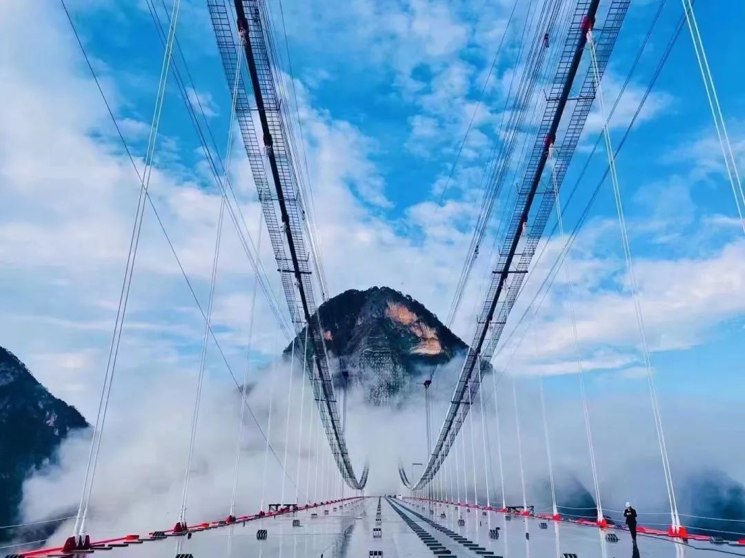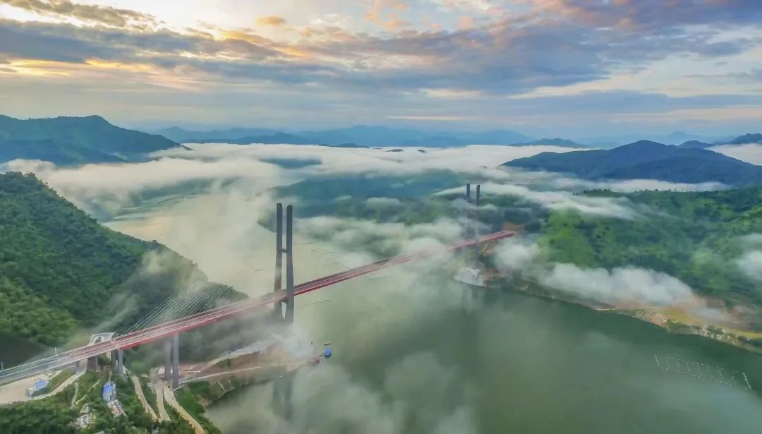 钻石形索塔设计,在云雾中若隐若现。在修建这座“天空之桥”时,建设者就地开采山石制作C50标号机制砂,并在320米高塔浇筑中实现“一泵到顶”的历史性突破,替代了天然河砂的使用。