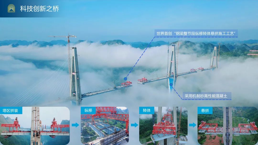 机制砂高性能混凝土、整节段纵移转体悬拼、梁底纵移悬拼、拱桥先建后拆等等一系列原创技术,让一座座雄伟壮观的大桥雄踞在贵州的山水之间,悬索、斜拉、拱式、梁式等3万多座千姿百态的桥梁,成就了万桥飞架群山之上的绝美风景,贵州修建的桥梁从200、300米跨径到了1420米,不但跨越了北盘江、乌江、赤水河,还正在跨越黄河、长江和澜沧江。贵州桥成为当代桥梁的百科全书,几乎包揽了当今世界上全部桥型。