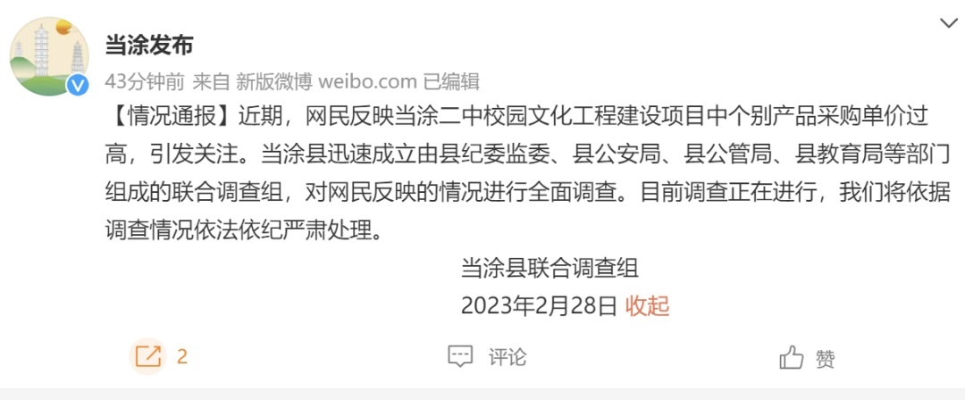 据@当涂发布,2月28日,当涂县联合调查组发布情况通报,近期,网民反映当涂二中校园文化工程建设项目中个别产品采购单价过高,引发关注。当涂县迅速成立由县纪委监委、县公安局、县公管局、县教育局等部门组成的联合调查组,对网民反映的情况进行全面调查。目前调查正在进行,我们将依据调查情况依法依纪严肃处理。
