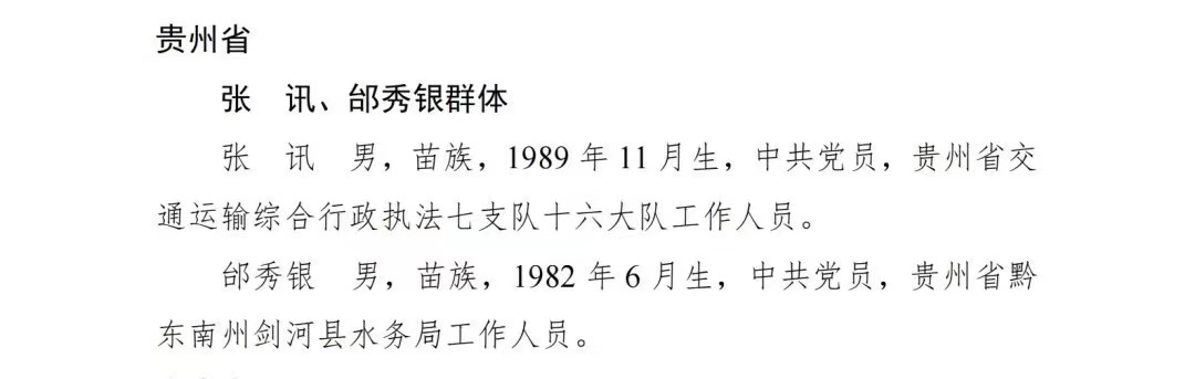 ▲3月27日,中央政法委发布2022年第四季度和2023年第一季度“见义勇为勇士榜”,共有63位勇士光荣上榜。其中,贵州省交通运输综合行政执法七支队十六大队工作人员张迅、贵州省黔东南州剑河县水务局工作人员邰秀银2人群体上榜。详情