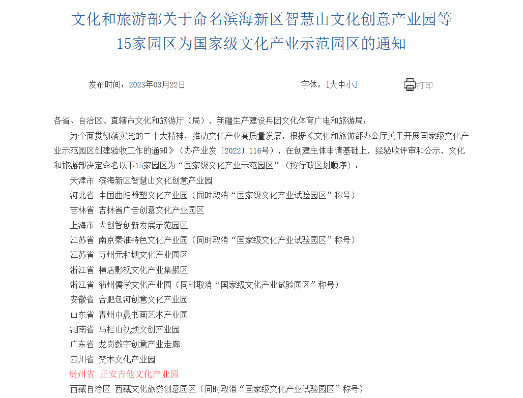 据文化和旅游部网站消息,文化和旅游部日前印发《关于命名滨海新区智慧山文化创意产业园等15家园区为国家级文化产业示范园区的通知》,并在全国文化和旅游产业发展工作会议上对新命名的园区进行授牌。其中,贵州省正安吉他文化产业园入选。