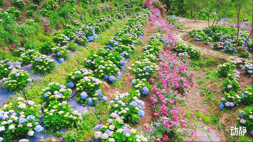 5月,是绣球花开放的时节。神泉谷景区内种植了50000株不同种类、不同品种的绣球花,蓝的、紫的、红的、粉的,层层叠叠,五彩斑斓的花海将景区点缀得无比浪漫。