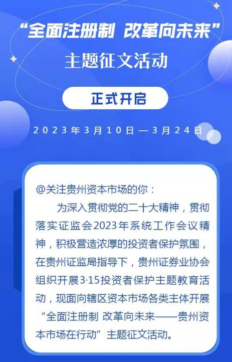 为深入贯彻落实证监会2023年系统工作会议精神,做好投资者合法权益保护工作,助力资本市场平稳健康发展,合力营造浓厚的投资者保护氛围,贵州证监局紧扣“3·15国际消费者权益保护日”重要时点,立足辖区实际,精心策划,多措并举,组织开展投资者保护主题教育系列活动,紧紧围绕“全面注册制 改革向未来”主题,深化活动内涵、突出宣传重点、创新宣传方式,在3月15日当天统一行动,拉开活动大幕,奏响辖区投资者保护“主旋律”,促进辖区投资者教育与保护工作提质增效。