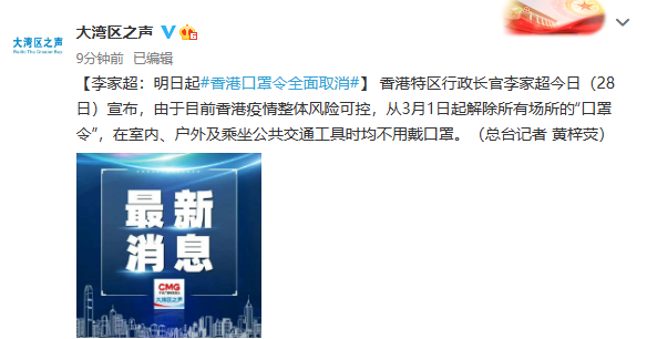 据大湾区之声消息,香港特区行政长官李家超28日宣布,由于目前香港疫情整体风险可控,从3月1日起解除所有场所的“口罩令”,在室内、户外及乘坐公共交通工具时均不用戴口罩。