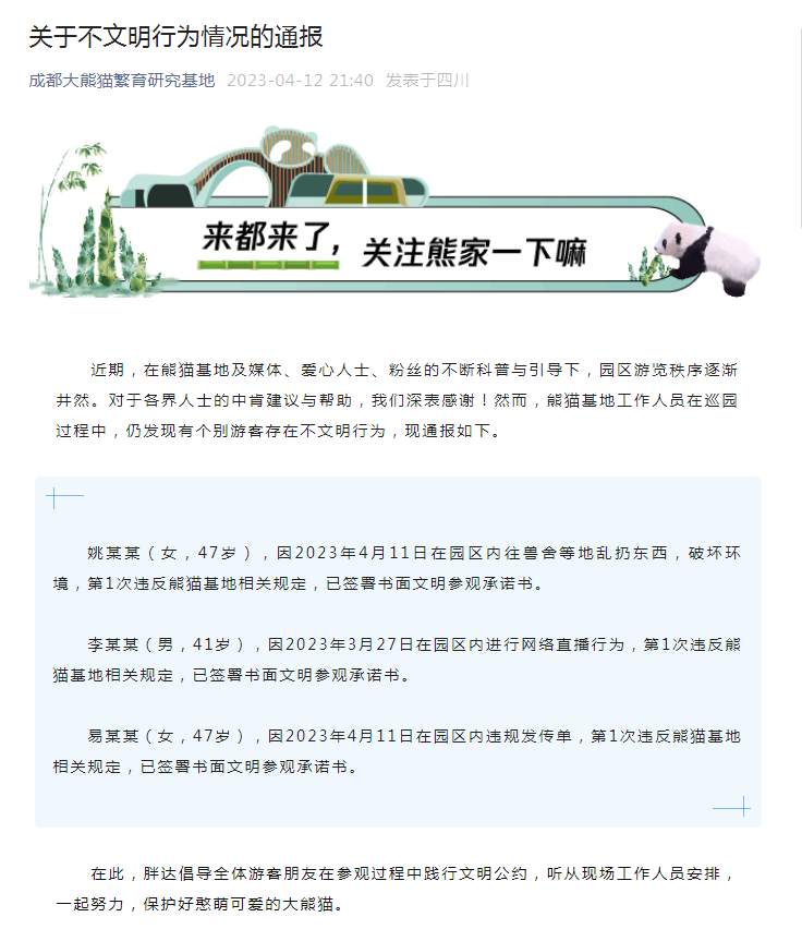4月12日,四川成都大熊猫繁育研究基地通报3起不文明游客行为。3人分别因在园区内往兽舍等地乱扔东西,进行网络直播行为,违规发传单等行为,违反熊猫基地相关规定。基地发出倡导,希望游客在参观过程中文明游览,听从现场工作人员安排。