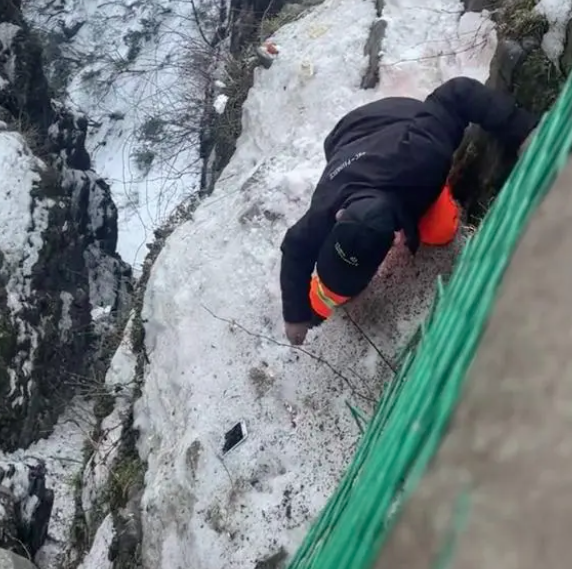 视频中,一名游客手机不慎掉落悬崖边,此时有环卫工翻过护栏下到悬崖边帮游客捡手机。