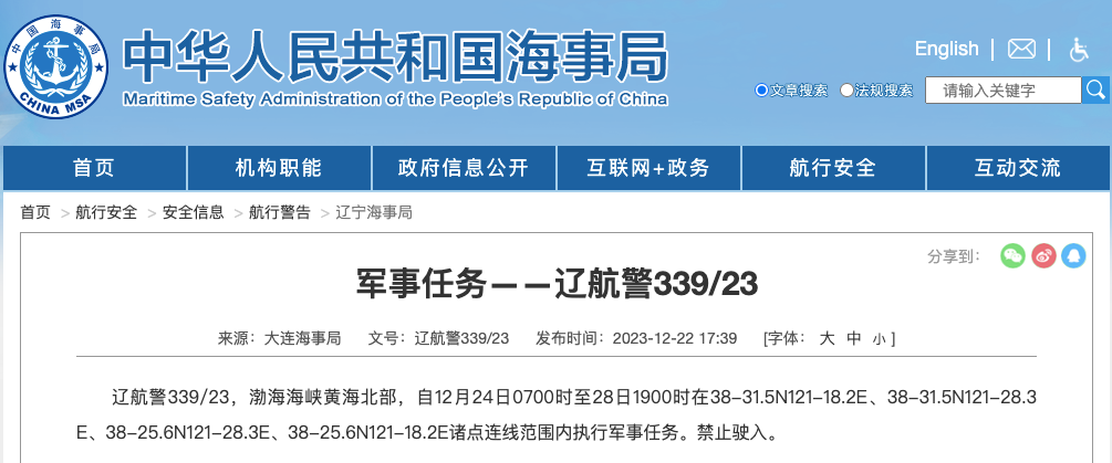 据中国海事局网站消息,大连海事局发布航行警告,12月24日7时至12月28日19时,渤海海峡黄海北部部分水域范围内执行军事任务。禁止驶入。