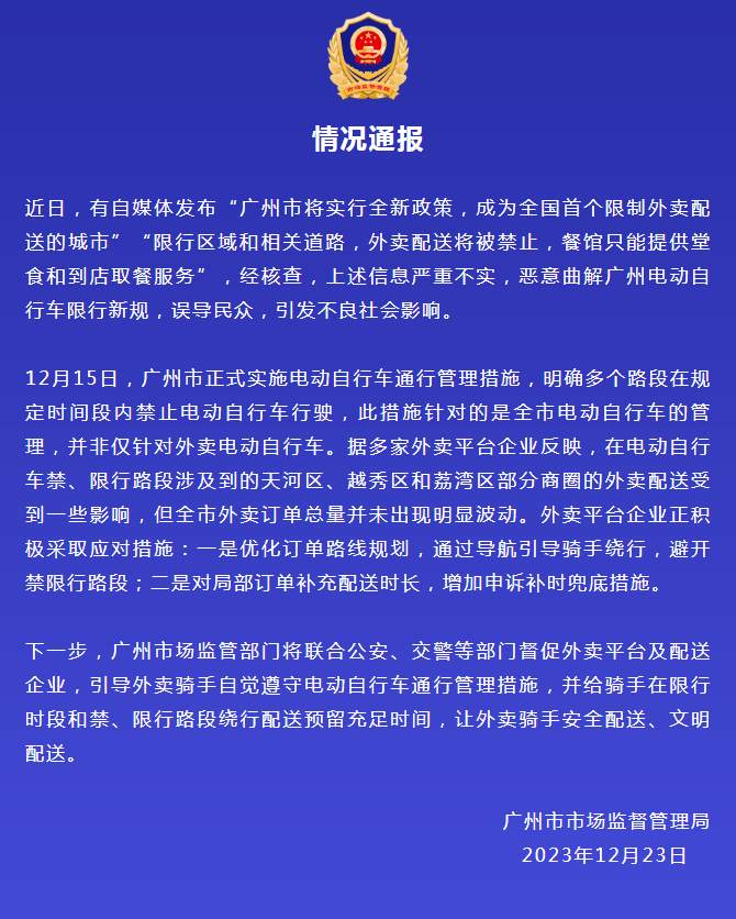 12月23日,针对网传广州“限制外卖”,广州市市场监督管理局发布通报,具体内容如下↓