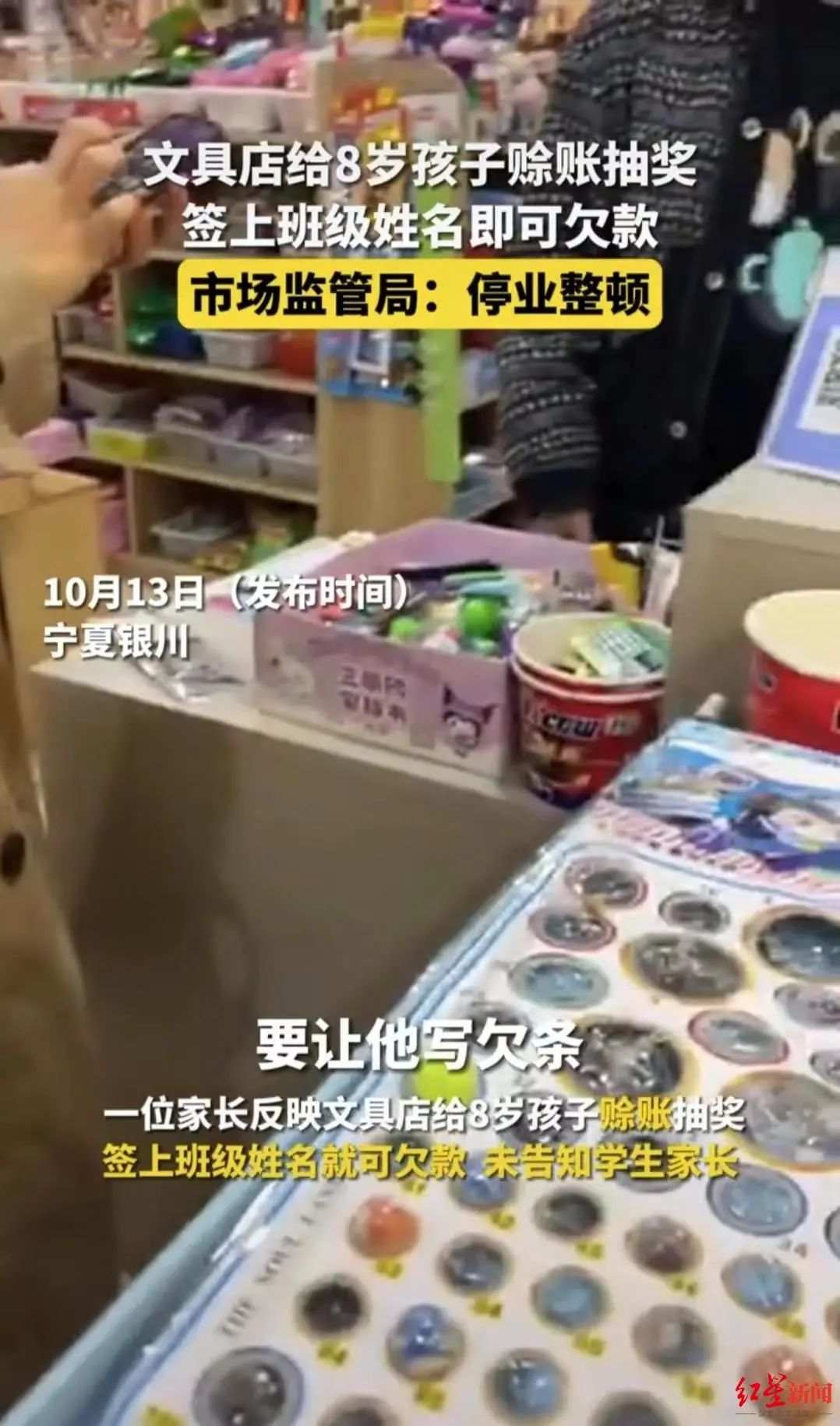 10月10日,宁夏银川有家长反映一文具店给自己的8岁孩子赊账抽奖,欠条上写明班级、姓名就可欠款,引发网友热议。家长在投诉视频里愤怒地说道,“他有钱吗,你给他赊东西?”“有人要求你就给他赊吗?”“一个成年人怎么可以随便纵容孩子赊东西呢?”
