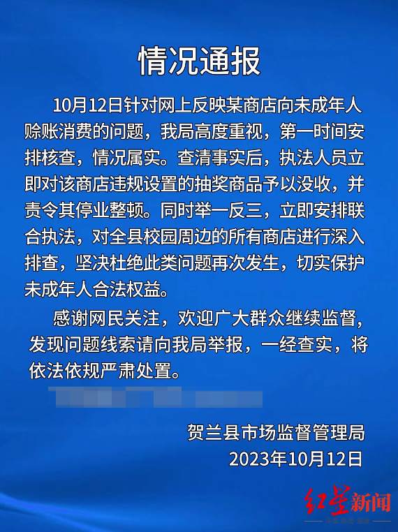 10月12日,宁夏贺兰县市场监督管理局发布通报称,针对网上反映某商店向未成年人赊账消费的问题,监管局高度重视,第一时间安排核查,情况属实。查清事实后,执法人员立即对该商店违规设置的抽奖商品予以没收,并责令其停业整顿。同时,该局立即安排联合执法,对全县校园周边的所有商店进行深入排查,杜绝此类问题再次发生。