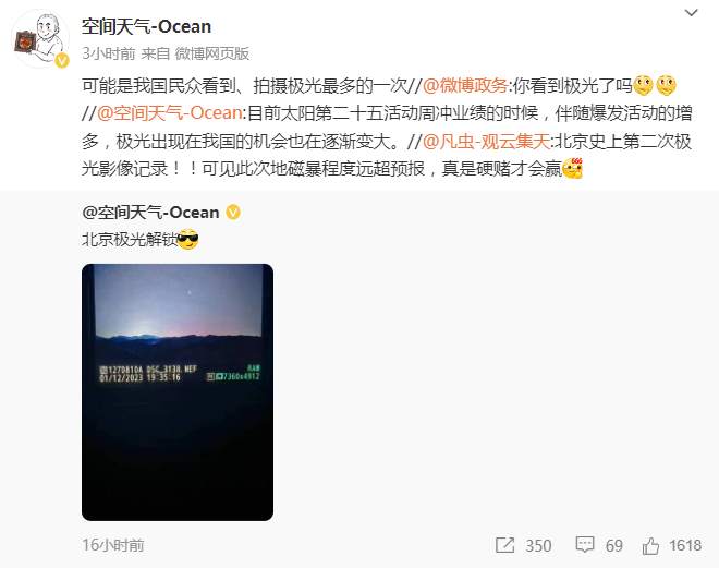 据中国气象局国家空间天气监测预警中心消息,12月1日20时到23时发生大地磁暴,我国多地出现极光活动,风云三号D星在太空清晰捕捉到此次极光活动的发生范围,优异的大气能见度使得远在北京的人们也能拍到极光。