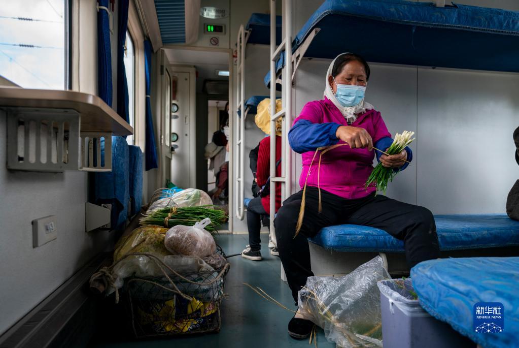 6月2日,5652次列车上,一名菜农在整理农产品。新华社记者 陈欣波 摄