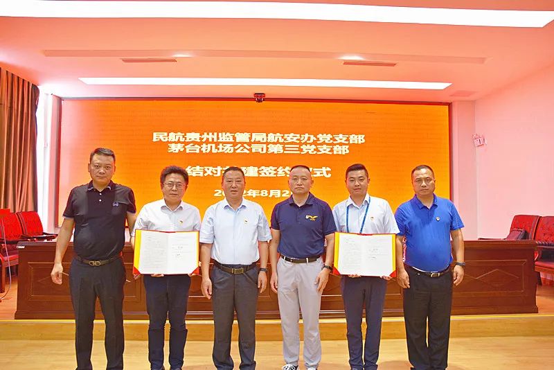 会后,民航贵州监管局航安办党支部与茅台机场公司第三党支部进行结对共建签约仪式。