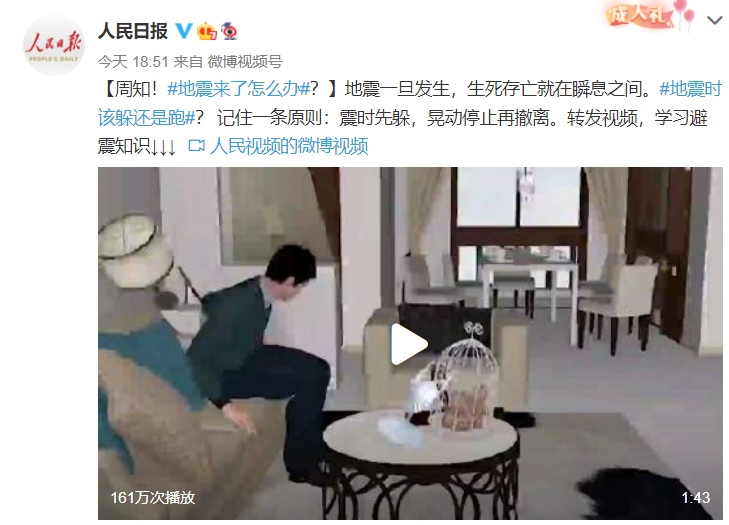 地震一旦发生,生死存亡就在瞬息之间。地震时该躲还是跑? 记住一条原则:震时先躲,晃动停止再撤离。转发视频,学习避震知识。