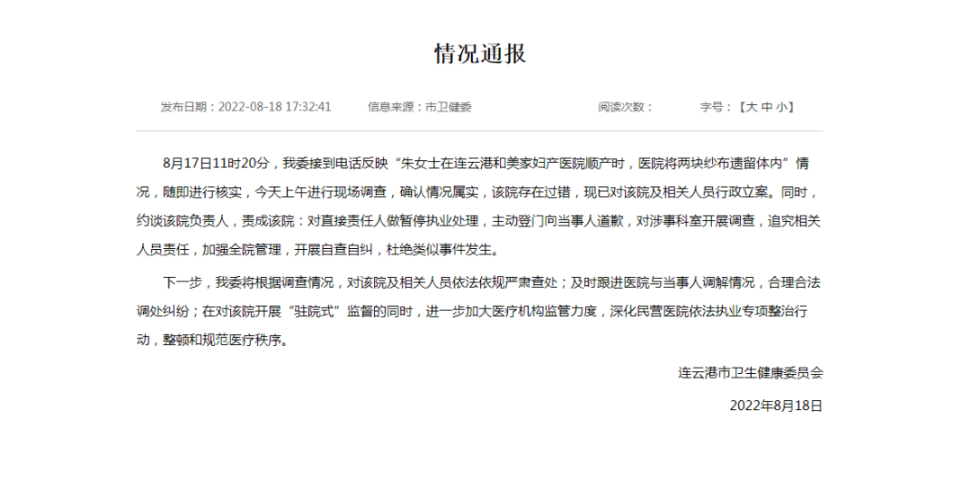 8月18日,连云港市卫生健康委员会发布情况通报:8月17日11时20分,我委接到电话反映“朱女士在连云港和美家妇产医院顺产时,医院将两块纱布遗留体内”情况,随即进行核实,今天上午进行现场调查,确认情况属实,该院存在过错,现已对该院及相关人员行政立案。同时,约谈该院负责人,责成该院:对直接责任人做暂停执业处理,主动登门向当事人道歉,对涉事科室开展调查,追究相关人员责任,加强全院管理,开展自查自纠,杜绝类似事件发生。