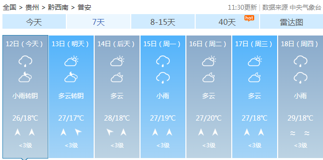 今天夜间到15日白天,省的南部地区多云有分散阵雨或雷雨,其余地区多云到晴,省的东部及赤水河谷午后有35℃以上高温,个别县市超过37℃。