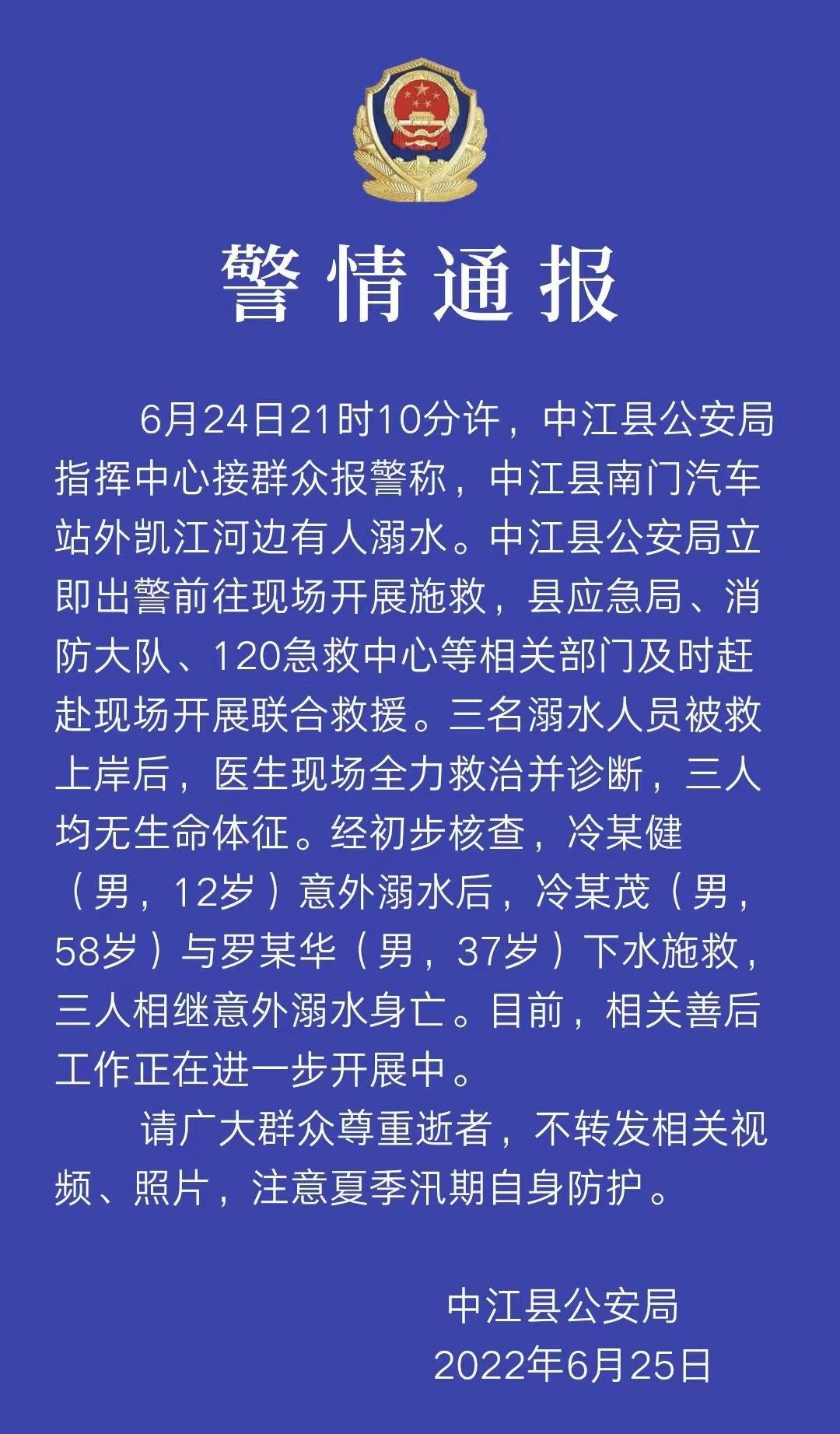 四川德阳中江县警方25日发布通告:6月24日21时10分许,四川德阳市中江县公安局指挥中心接群众报警称,中江县南门汽车站外凯江河边有人溺水。中江县公安局立即出警前往现场开展施救,县应急局、消防大队、120急救中心等相关部门及时赶赴现场开展联合救援。三名溺水人员被救上岸后,医生现场全力救治并诊断,三人均无生命体征。经初步核查,冷某健(男,12岁)意外溺水后,冷某茂(男,58岁)与罗某华(男,37岁)下水施救,三人相继意外溺水身亡。目前,相关善后工作正在进一步开展中。