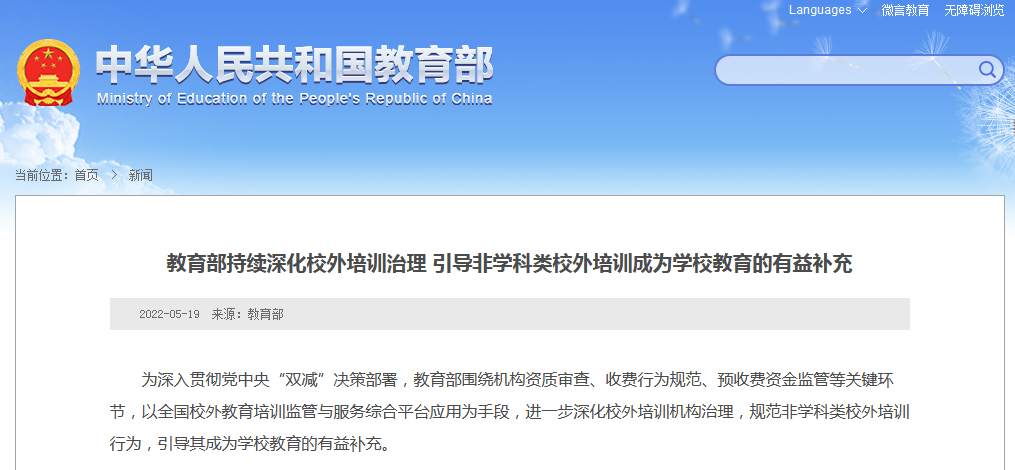 为深入贯彻党中央“双减”决策部署,教育部围绕机构资质审查、收费行为规范、预收费资金监管等关键环节,以全国校外教育培训监管与服务综合平台应用为手段,进一步深化校外培训机构治理,规范非学科类校外培训行为,引导其成为学校教育的有益补充。