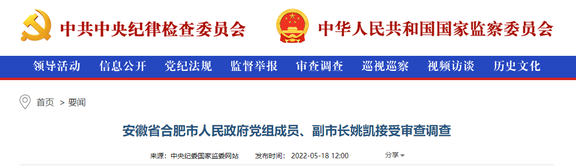 据安徽省纪委监委消息:安徽省合肥市人民政府党组成员、副市长姚凯接受纪律审查和监察调查。