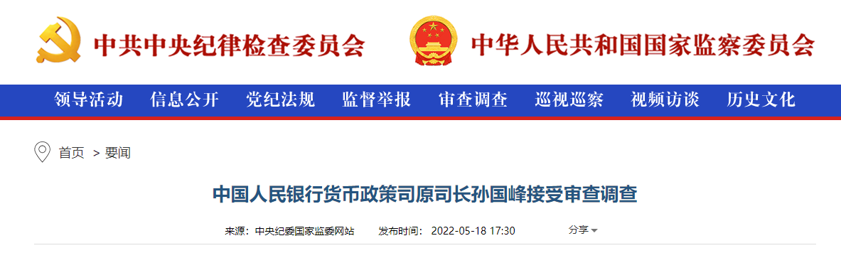 据中央纪委国家监委驻中国人民银行纪检监察组、天津市监察委员会消息:中国人民银行货币政策司原司长孙国峰涉嫌严重违纪违法,目前正接受纪律审查和监察调查。