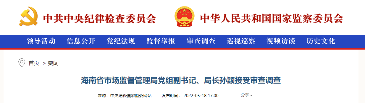 据海南省纪委监委消息:海南省市场监督管理局党组副书记、局长孙颖涉嫌严重违纪违法,目前正接受海南省纪委监委纪律审查和监察调查。