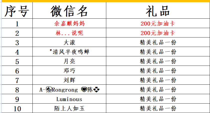 参加活动的中奖名单