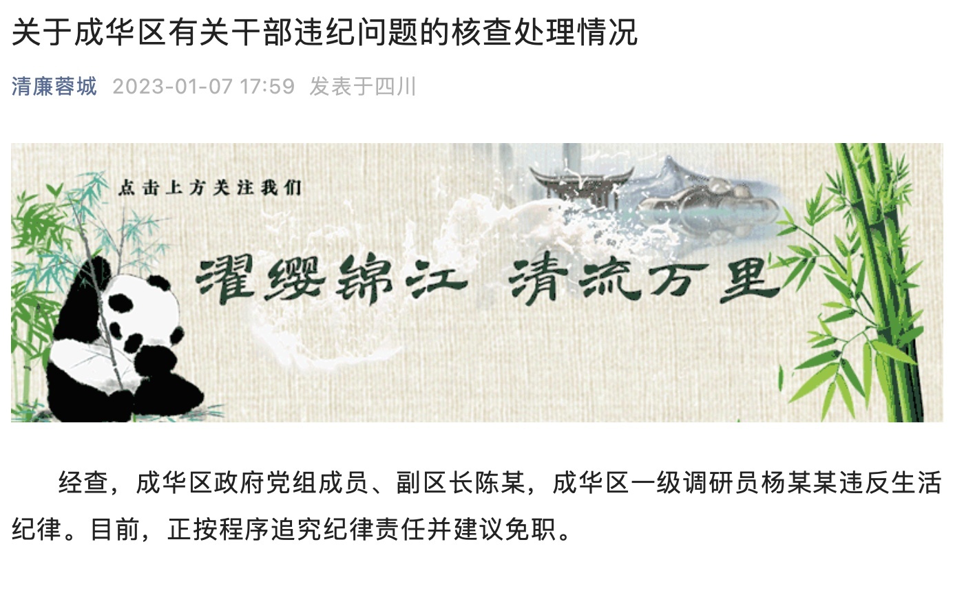 1月7日晚,成都市纪委监委官方微信号“清廉蓉城”发布“关于成华区有关干部违纪问题的核查处理情况”: