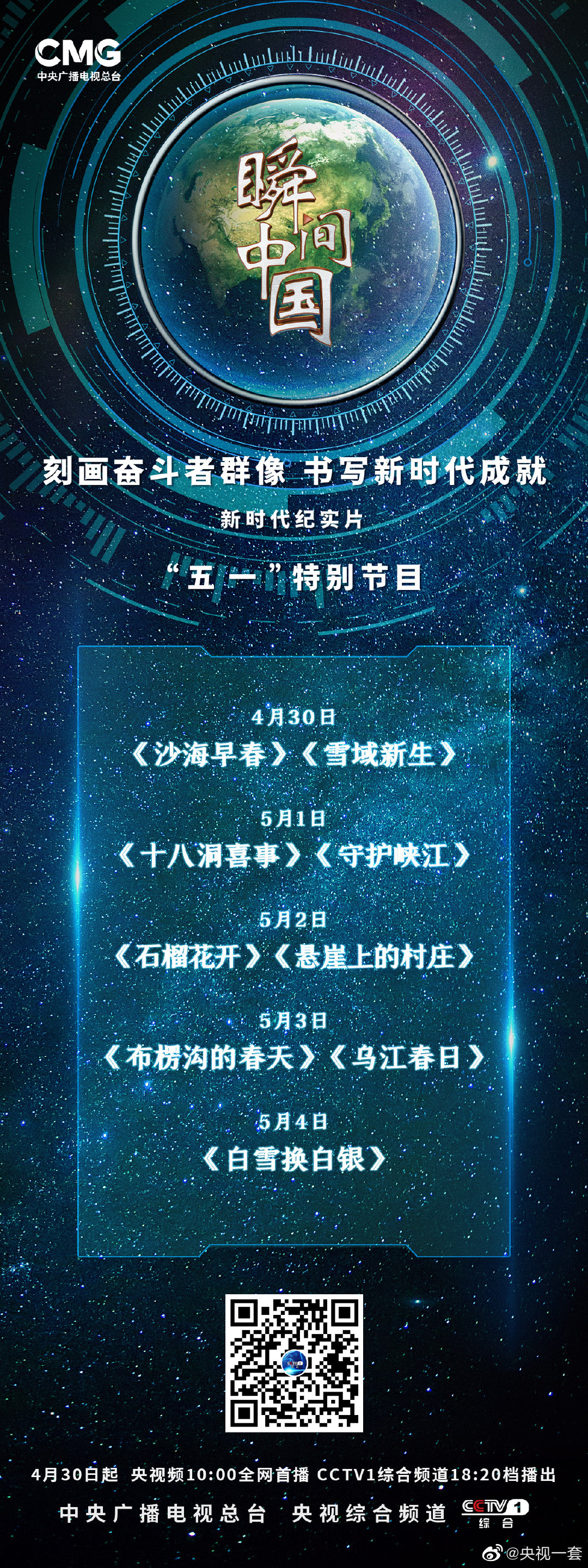节目将于4月30日~5月4日,上午10:00在央视频平台全网首播,当日18:20档在央视综合频道播出。