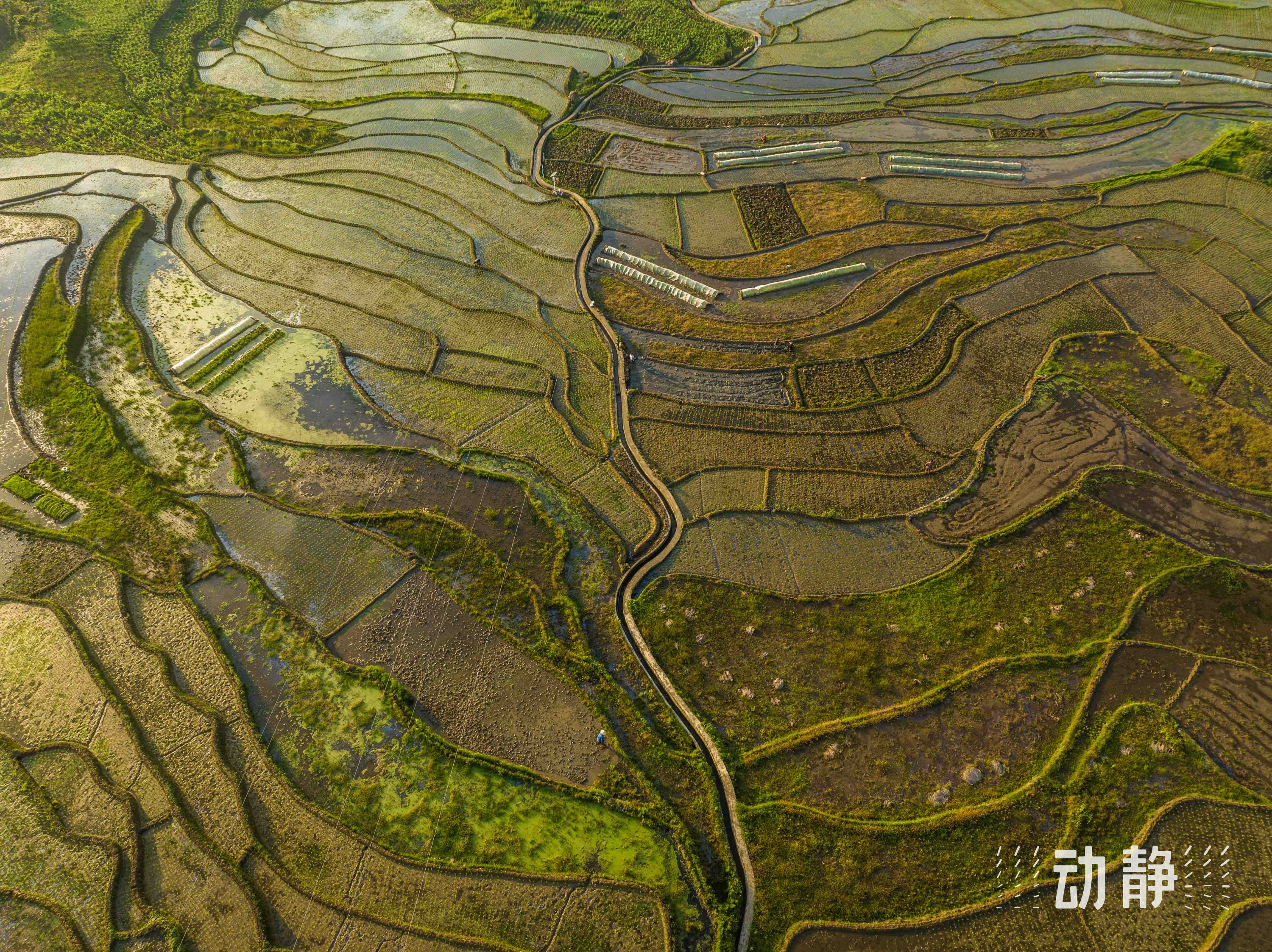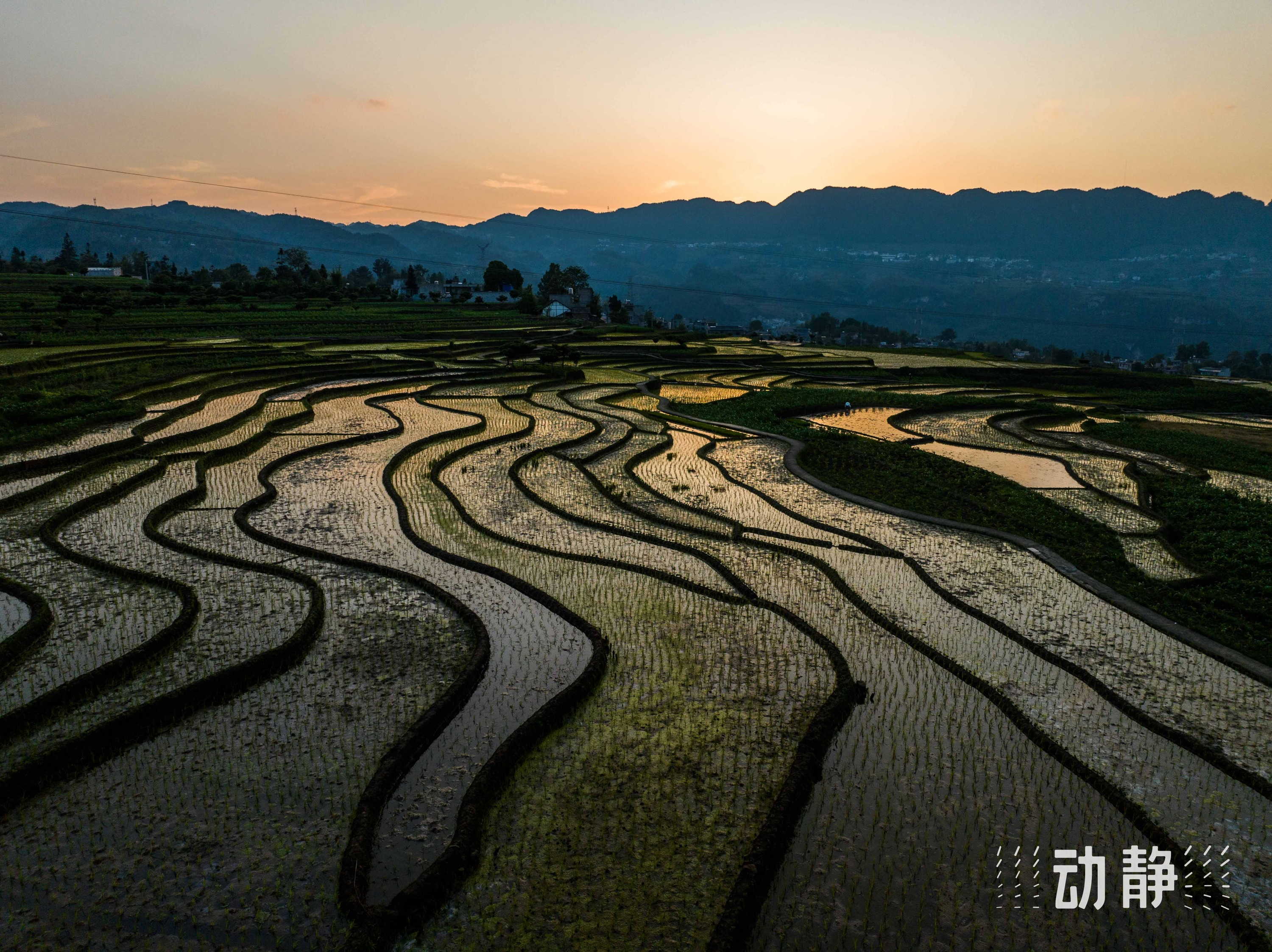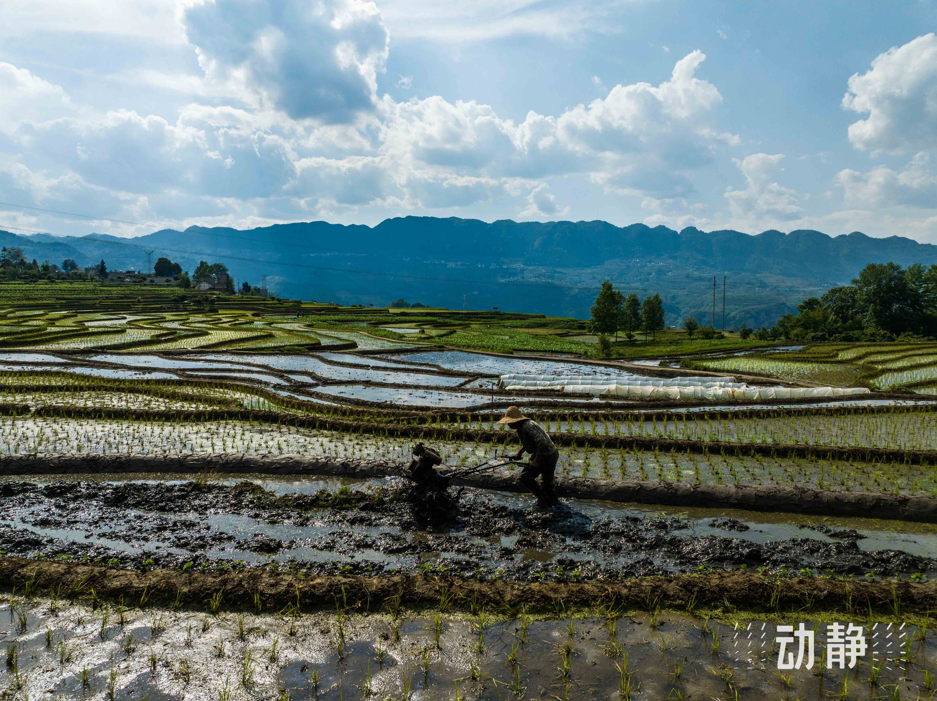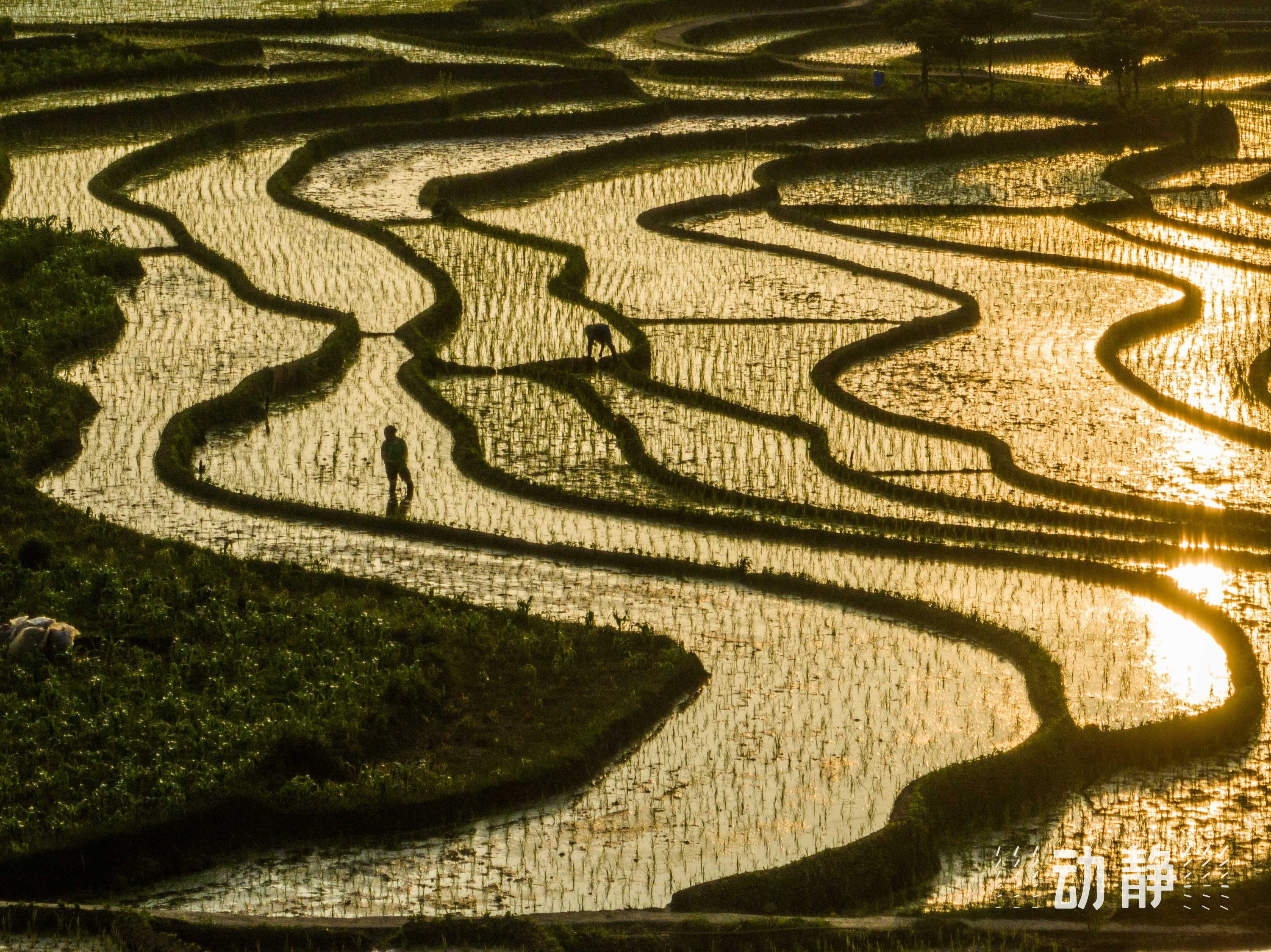 初夏时节,在位于乌蒙山腹地的毕节市大方县小屯乡梯田里,村民们抢抓农时在稻田里进行整地、插秧、施肥等作业。从高空俯瞰,村民耕耘的身影宛如田间跳动的音符,在稻田里谱写着劳作之歌,描绘出一幅初夏美好画卷。