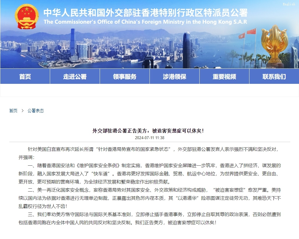 7月11日,外交部驻港公署发表声明。针对美国白宫宣布再次延长所谓“针对香港局势宣布的国家紧急状态”,外交部驻港公署发言人表示强烈不满和坚决反对,并强调: