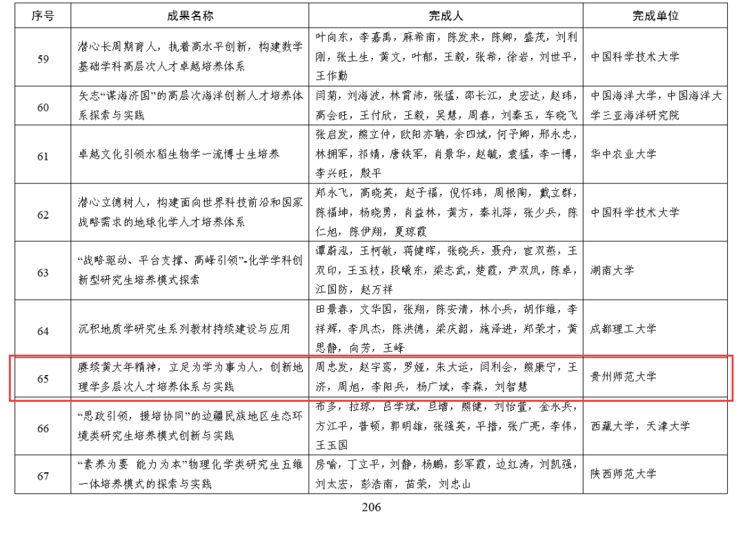 今年7月24日,教育部网站公布《关于批准2022年国家级教学成果奖获奖项目的决定》(教师〔2023〕4号),周忠发领衔的“赓续黄大年精神,立足为学为事为人,创新地理学多层次人才培养体系与实践”项目获2022年高等教育(研究生)国家级教学成果二等奖。