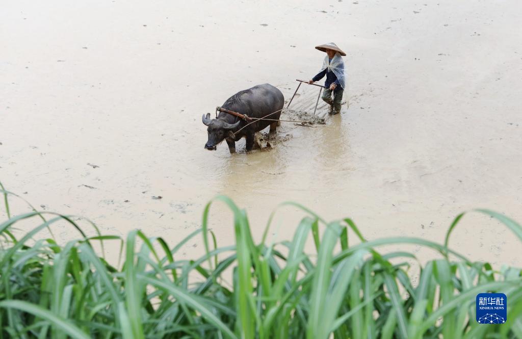 6月5日,农民在贵州省黔东南苗族侗族自治州施秉县双井镇翁西村耙田,准备插秧。新华社发(邰胜智摄)