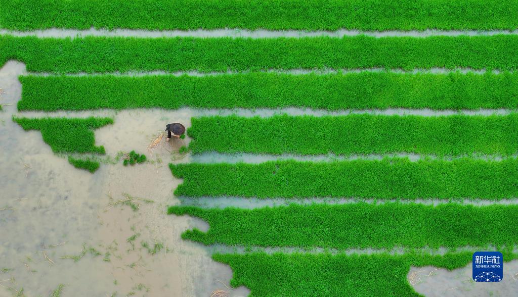 6月5日,村民在贵州省黔东南苗族侗族自治州岑巩县大有镇异溪村杂交水稻制种基地劳作(无人机照片)。新华社发(杨云摄)