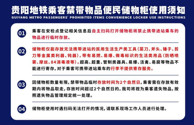 1.乘客在安检点登记相关信息后自主扫码打开储物柜将禁止携带进站乘车的物品进行临时存放。因乘客自身原因(信息填错等)造成的物品遗失等情况,我司概不负责。