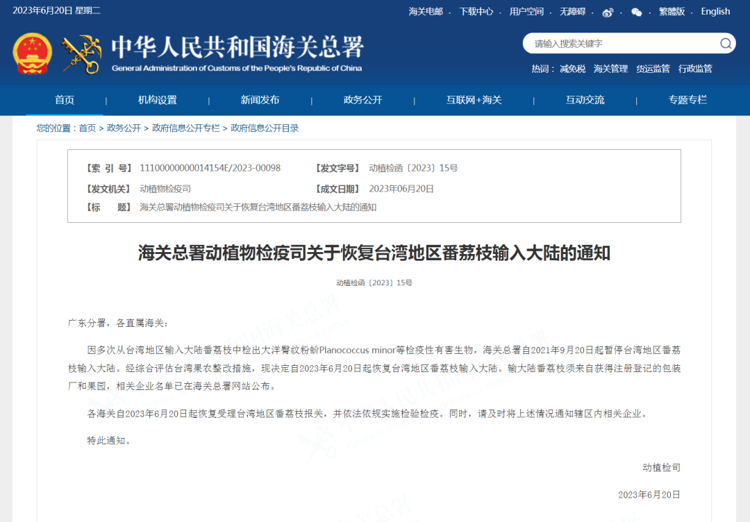 各海关自2023年6月20日起恢复受理台湾地区番荔枝报关,并依法依规实施检验检疫。同时,请及时将上述情况通知辖区内相关企业。