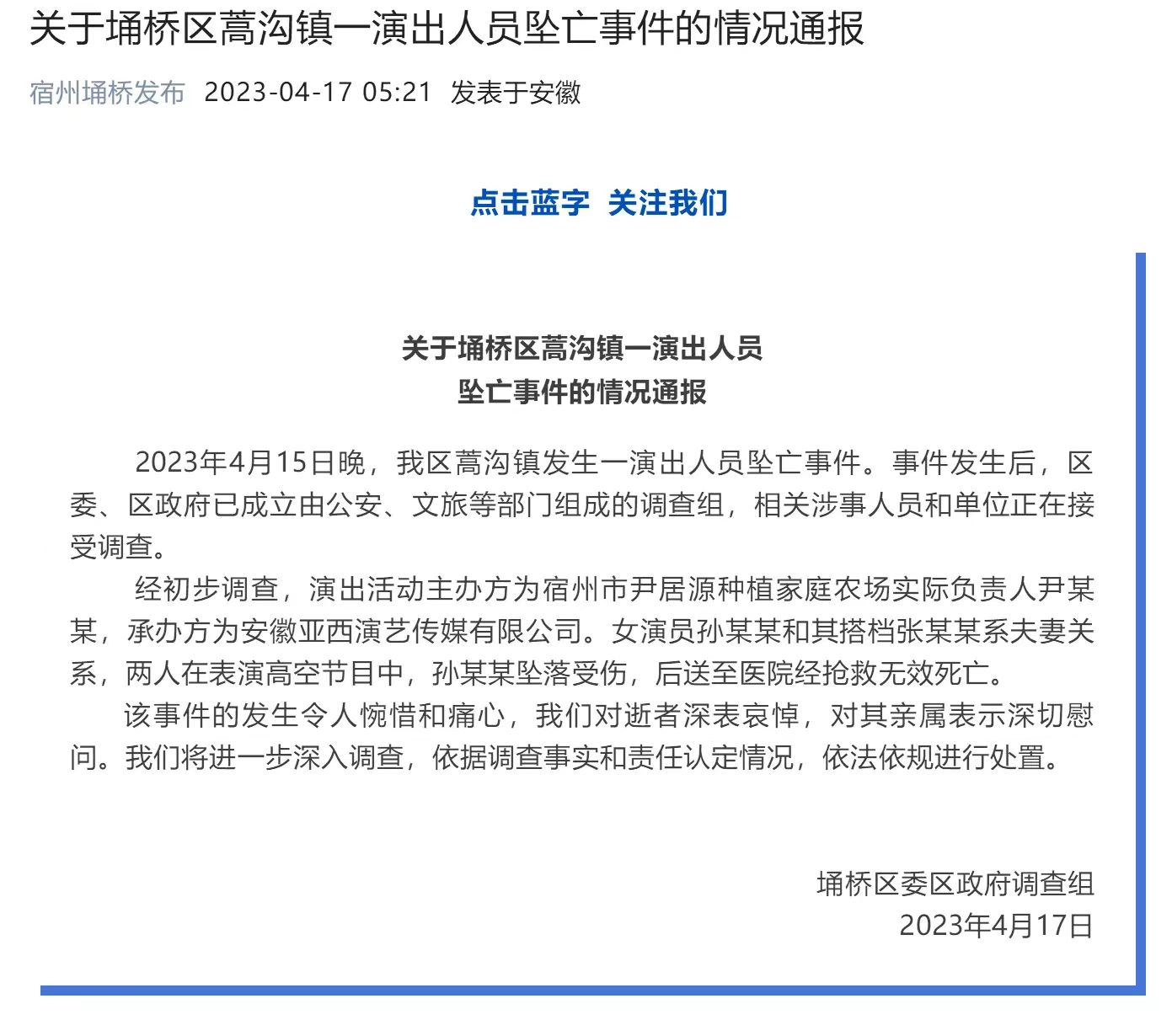 4月17日,安徽宿州埇桥区委区政府调查组发布“关于埇桥区蒿沟镇一演出人员坠亡事件的情况通报”,2023年4月15日晚,埇桥区蒿沟镇发生一演出人员坠亡事件。事件发生后,埇桥区委、区政府已成立由公安、文旅等部门组成的调查组,相关涉事人员和单位正在接受调查。