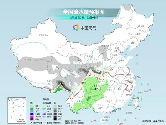 今明两天(2月21日至22日),冷空气进一步东移南下,我国雨雪范围将向东扩展,西部地区仍多降水,其中陕甘宁一带局地有大雪,当地需警惕道路结冰、积雪等对交通的不利影响。同时,中东部大部气温下降,其中长江中下游一带降温明显,多地最高气温普遍重回个位数,公众需注意防寒保暖。