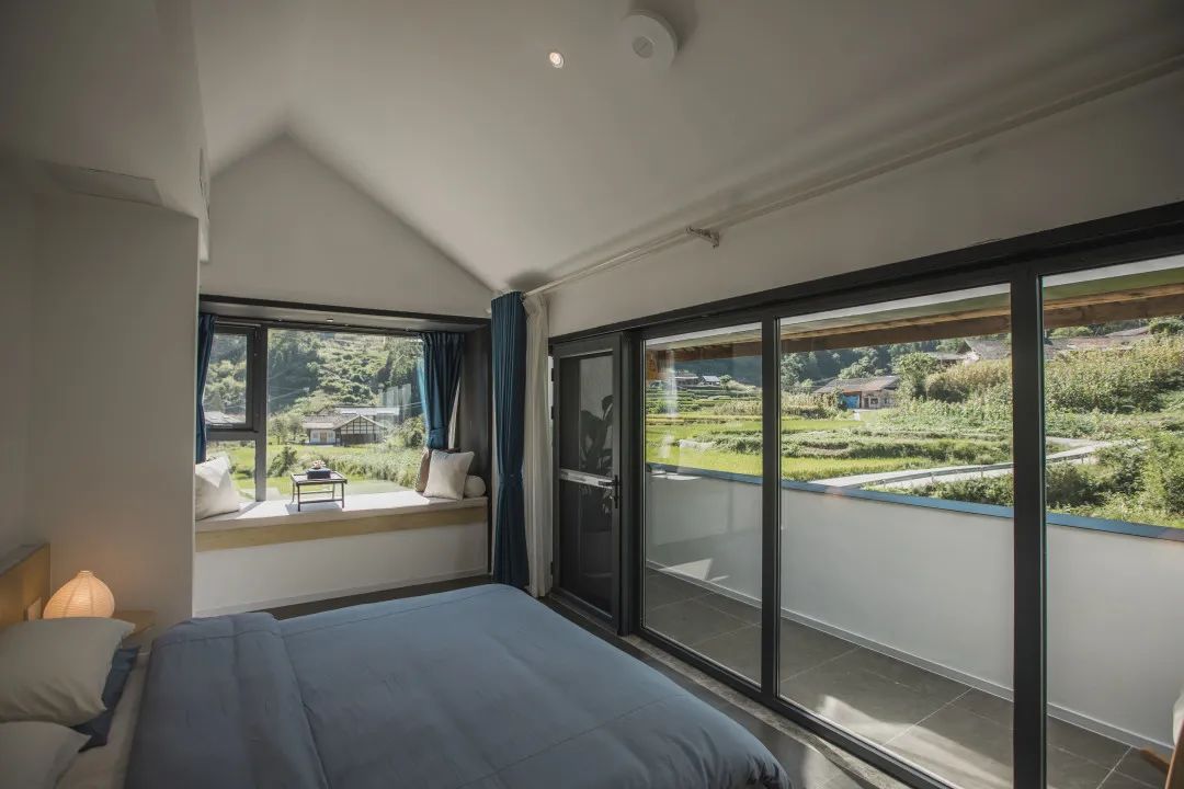 竹澜水寨有4层,13间客房,每一间的布置都干净温馨,展现着民宿主理人满满的心意。纯白的床幔,昏黄的灯光、精致的灯饰以及窗外的江景,温馨、闲适且美好。