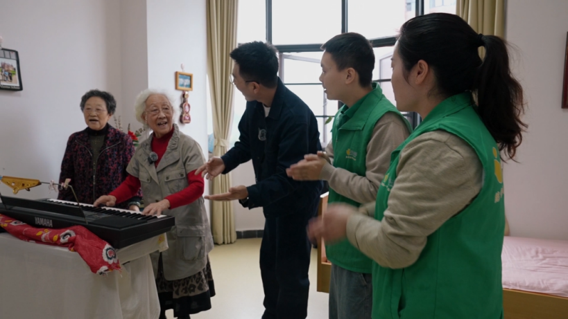 正如陪护人员所说,早操结束后90岁的赵庆英老人在早操结束后拉上好友和几位陪护人员来到她的房间,熟练的弹奏着钢琴,大家跟着伴奏欢快的合唱起来。“我退休前就是音乐老师,一直都喜欢弹弹唱唱,在这里我找到了志同道合的朋友,还有这些小年轻陪着我们,他们不仅拥有护理专业知识,还非常有耐心,我很满足,老友所养我想我已经找到了。”赵庆英老人高兴的说。