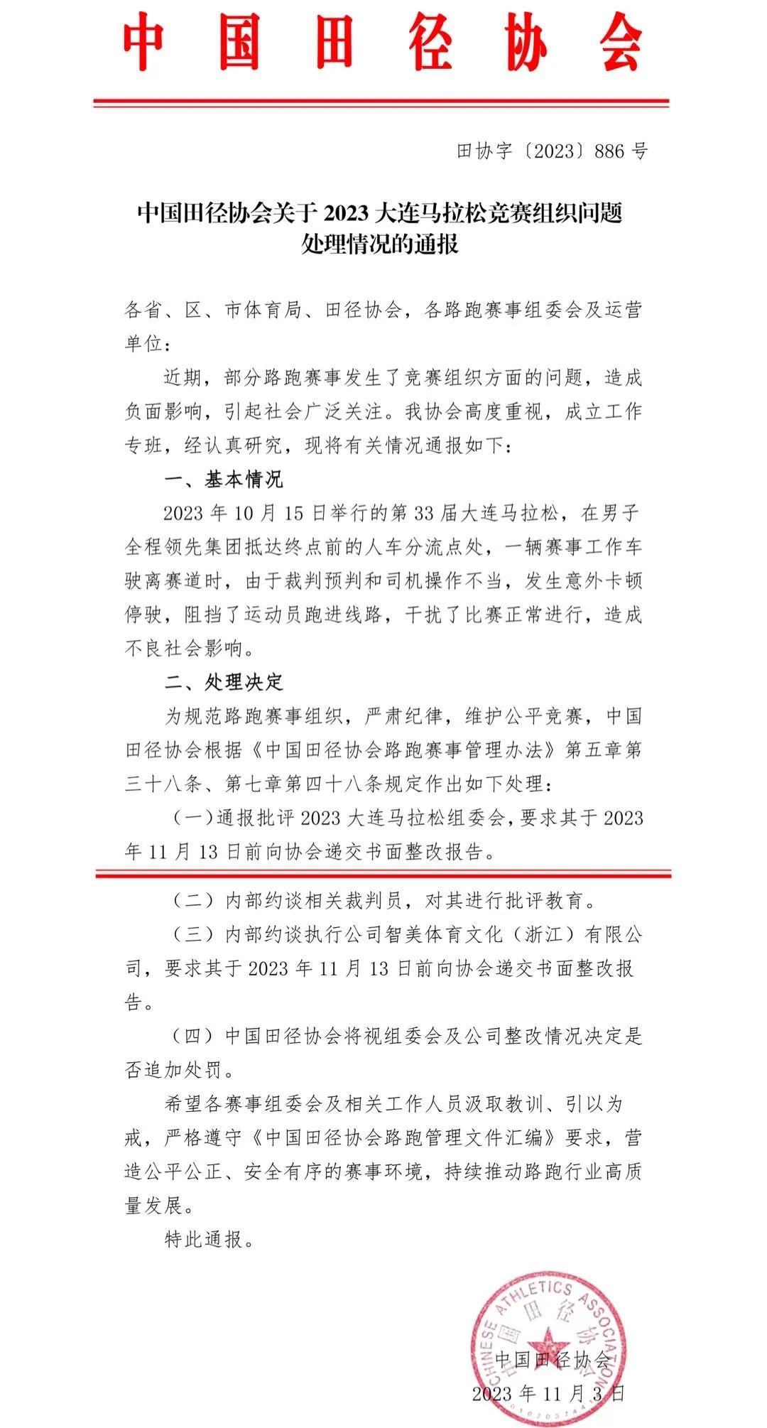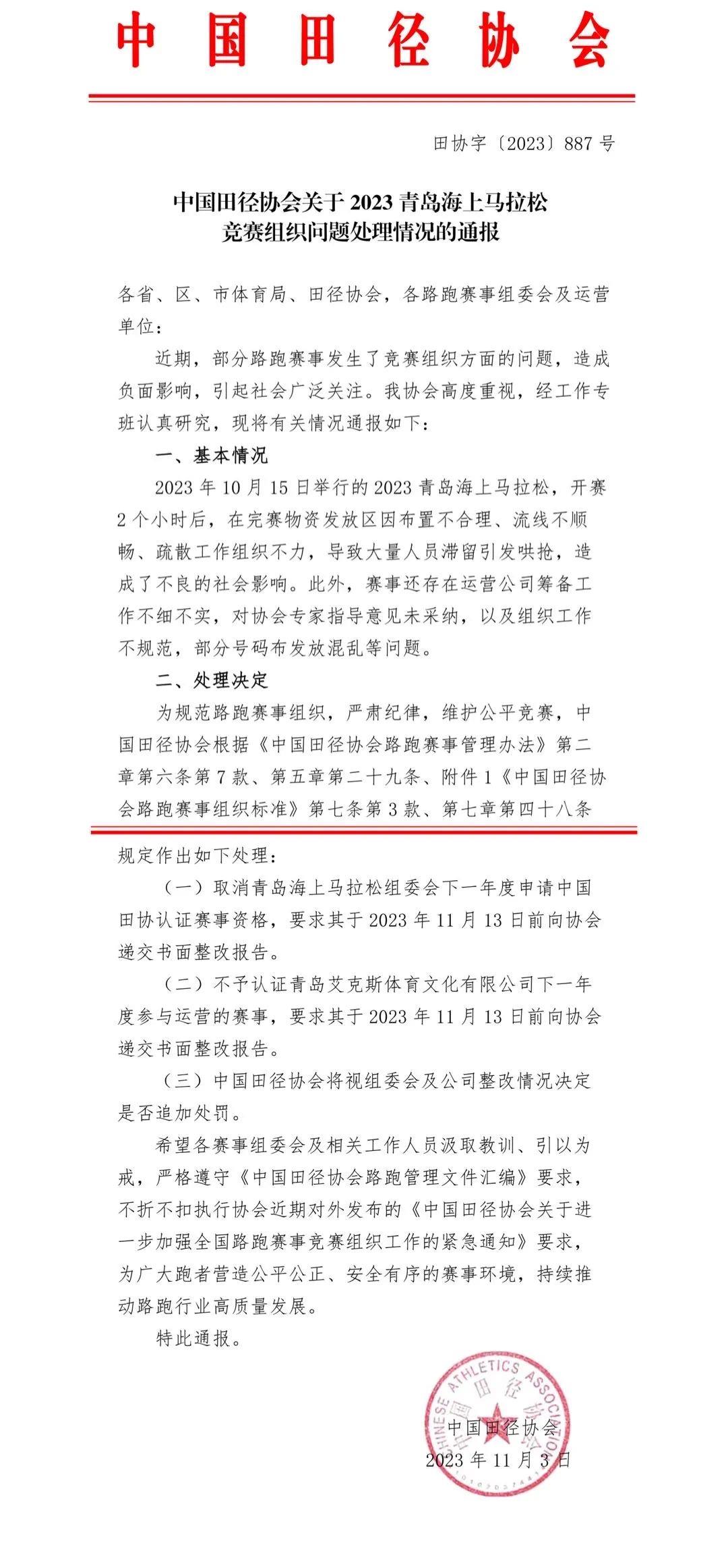 “中国马拉松平台”官微11月3日消息,近日,部分路跑赛事出现了一些竞赛组织问题,引发社会广泛关注,造成了不良的社会影响。中国田径协会高度重视、全面调查,依据事实和路跑赛事管理规定,从加强竞赛组织,压实各方主体责任,提示行业风险隐患的角度,对相关单位和人员进行了相应处理。现将处理情况通报如下: