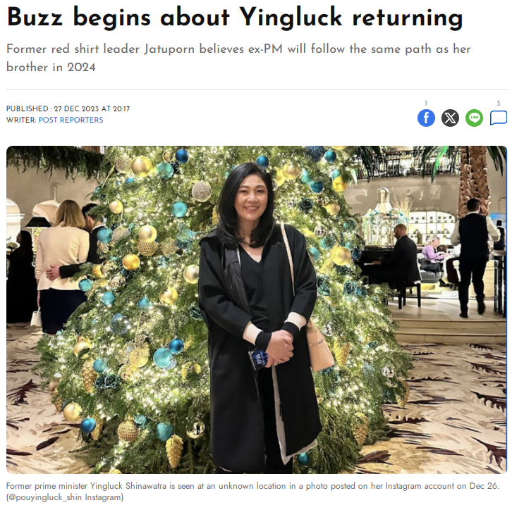 泰国反对派“红衫军”领导人贾都蓬还称,英拉可能在明年追随其哥哥、被监禁的前总理他信的脚步重返泰国。