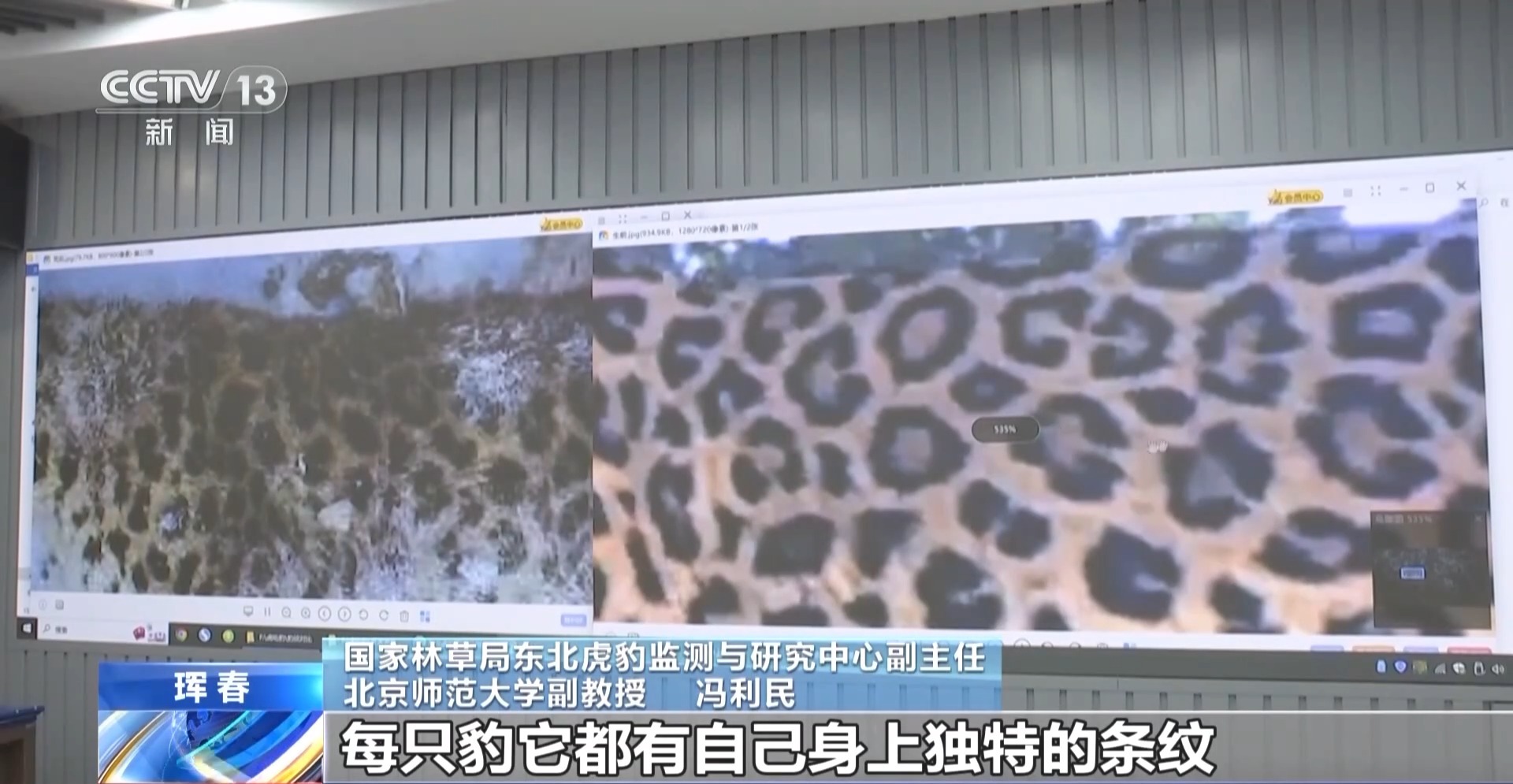 国家林草局东北虎豹监测与研究中心副主任 北京师范大学副教授 冯利民:800多条它的信息。怎么确认是它,我们来看。每只豹都有自己身上独特的条纹,它的豹纹是非常独特的,就像人的指纹一样,每只豹它身上的(纹)是独一无二的。把它同一侧的花纹来进行对比,我们可以看到这一块花纹是一样的。