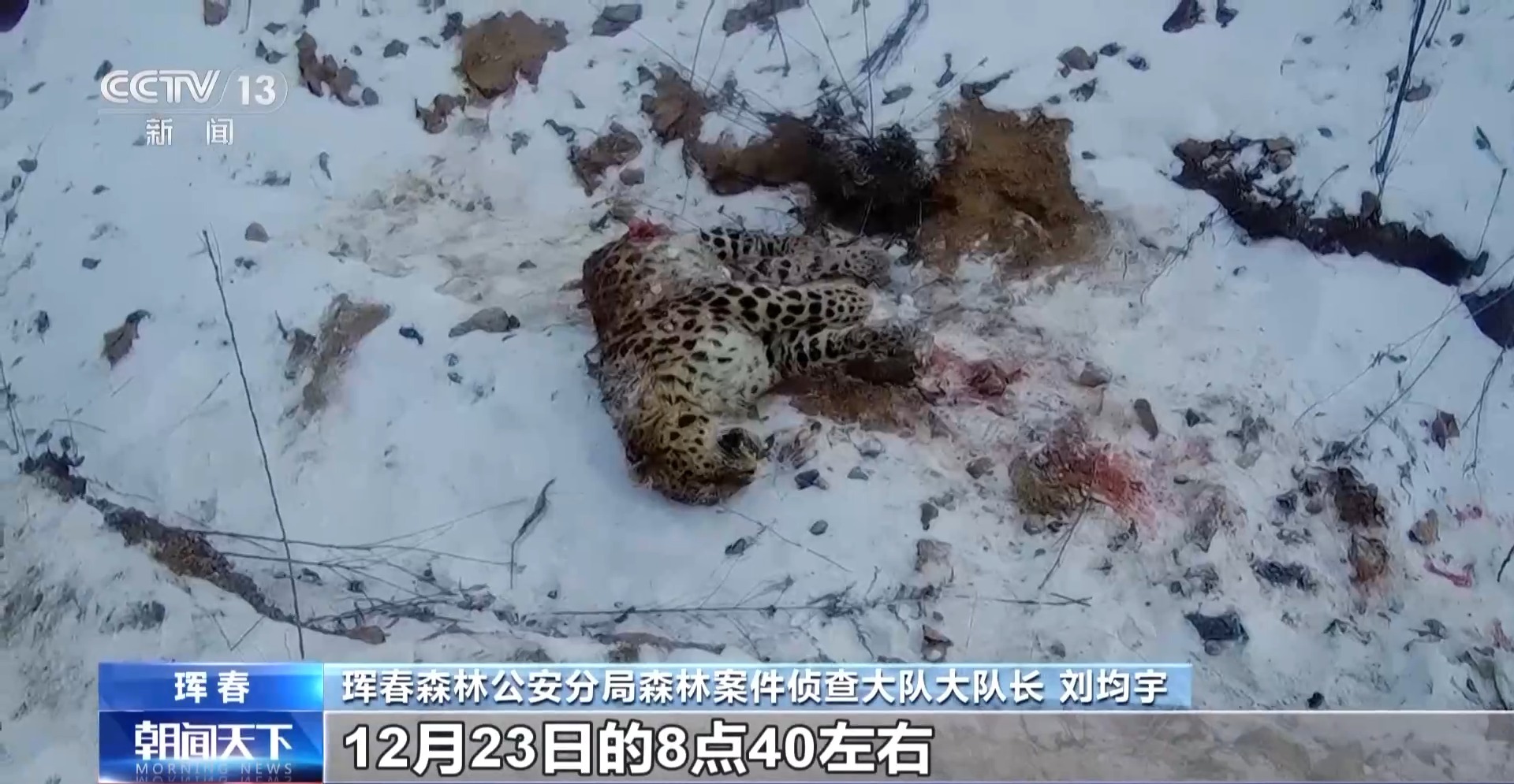 珲春森林公安分局森林案件侦查大队大队长 刘均宇:12月23日8时40分左右,我在单位接到春化派出所报案,在春化林业有限公司金泉岗发现一只东北豹尸体。