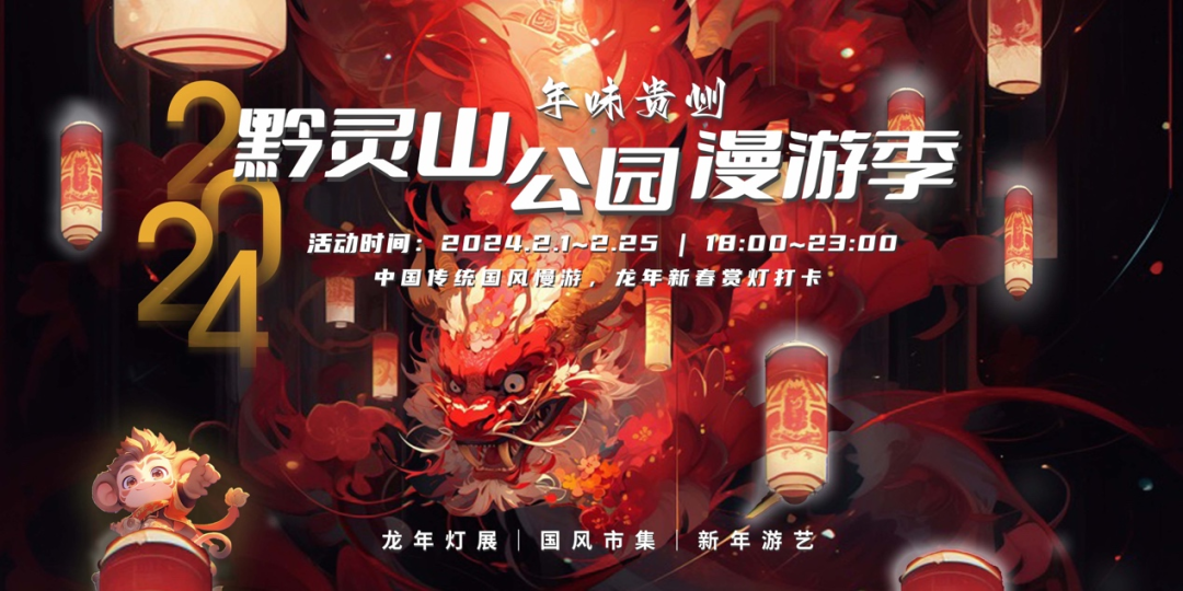 为庆贺2024龙年春节,黔灵山公园将于2月1日至2月25日举办夜间游园活动,邀您在喜庆的节日里赏龙年灯展、逛国风集市、玩新春游艺,共同祝愿新年福气满满、好运连连,在游玩中迎接吉祥龙年的到来。