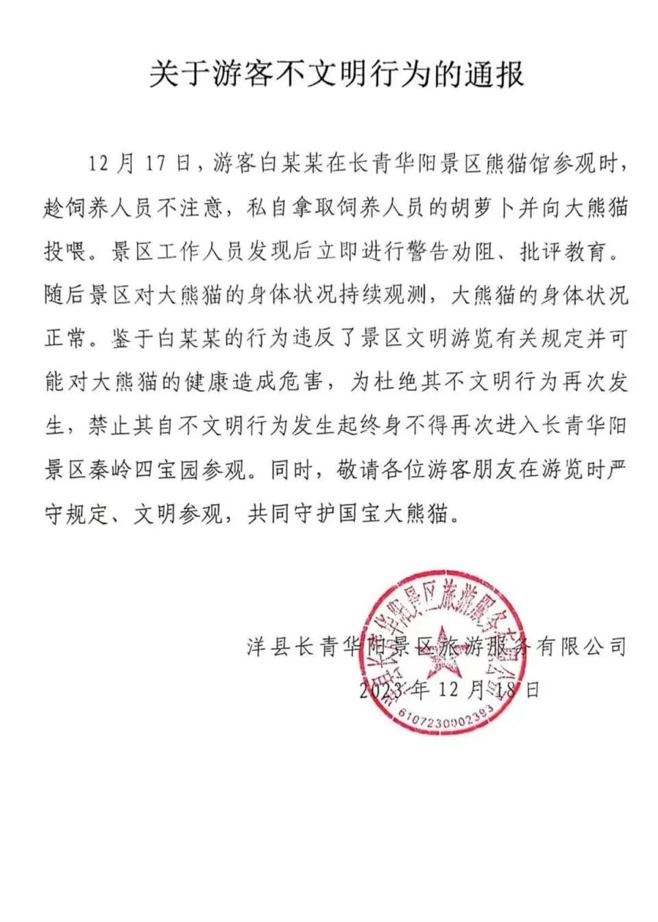 18日下午,洋县长青华阳景区旅游服务有限公司通报称,12月17日,游客白某某在长青华阳景区熊猫馆参观时,趁饲养人员不注意,私自拿取饲养人员的胡萝卜并向大熊猫投喂。景区工作人员发现后立即进行警告劝阻、批评教育。随后景区对大熊猫的身体状况持续观测,大熊猫的身体状况正常。