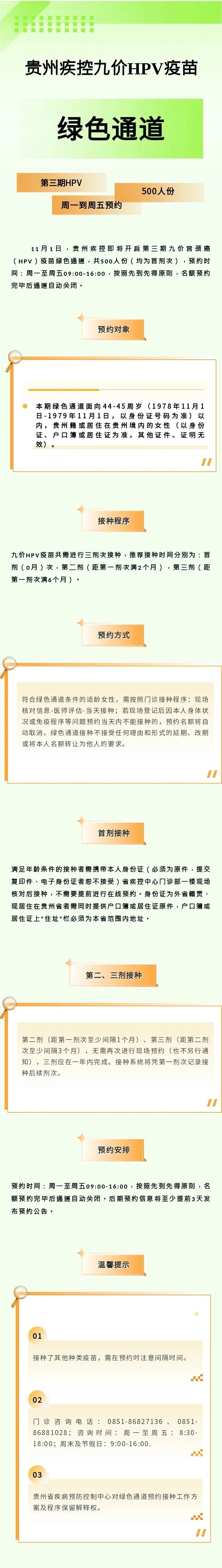 为满足广大群众疫苗接种需求,贵州省疾控中心于2023年10月28日(星期六)启动第十五期线上预约7000支九价人乳头瘤病毒疫苗(以下简称“HPV疫苗”,俗称“宫颈癌疫苗”);同时,贵州省疾控中心本月继续开通500支九价HPV疫苗绿色通道,现将相关事宜告知如下: